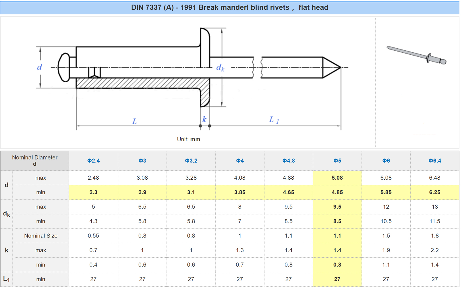 Material: Stainless Steel 304 Surface treament: Plain Size: φ3.2 φ4 φ4.8 Length: 6mm-20mm MOQ: 1000PCS Standard: DIN7337 A Certificate: ISO9001:2015